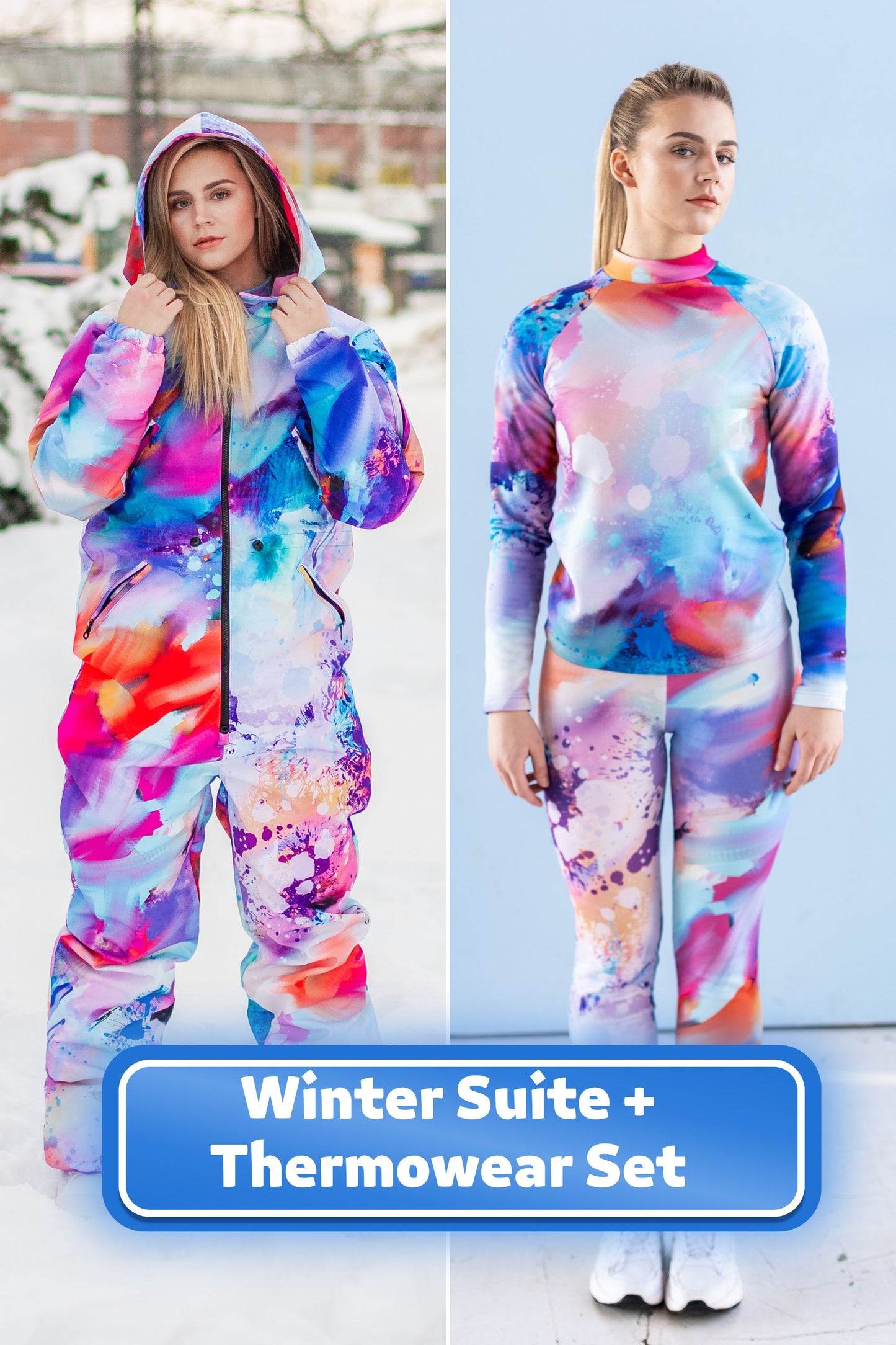 SET: Rosa Winter-Ski-Overall, Snowboard-Kleidung, Snowboard-Anzug, Ski-Overall, Damen-Bergbekleidung, Winter-Thermo-Unterwäsche