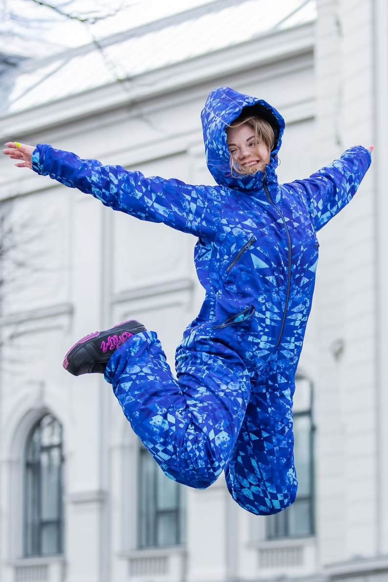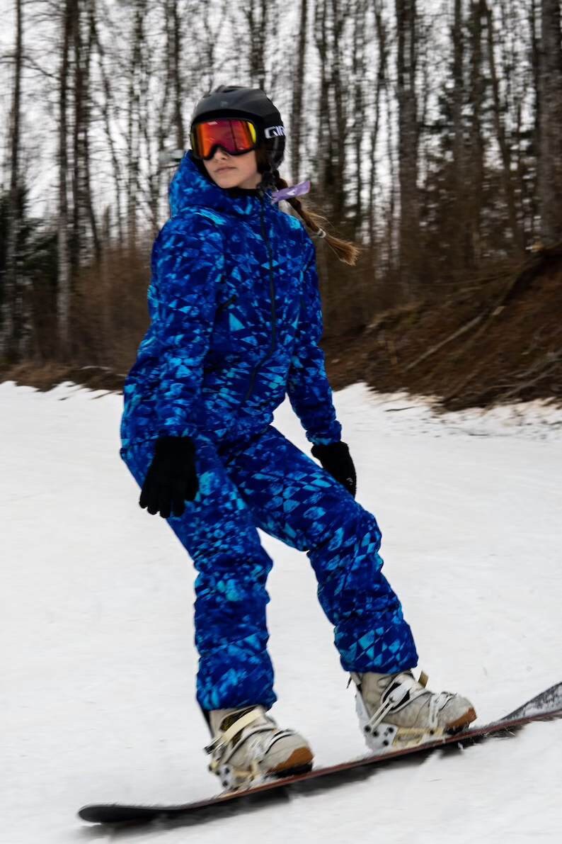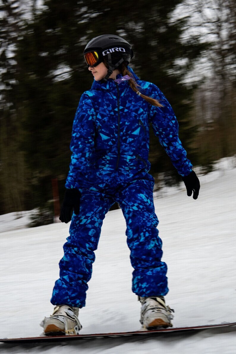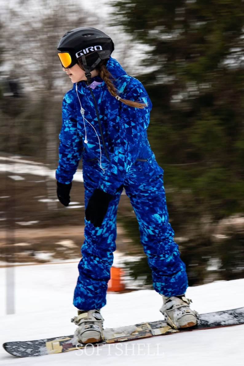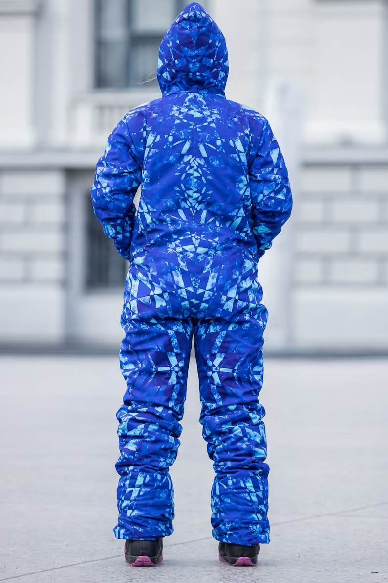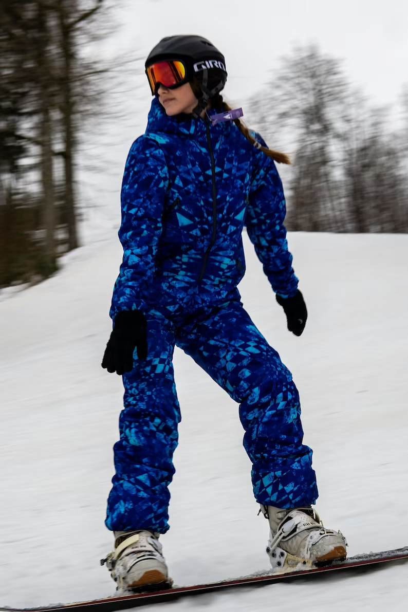 Winterlicher Ski-/Snowboardanzug mit abstraktem Blaudruck